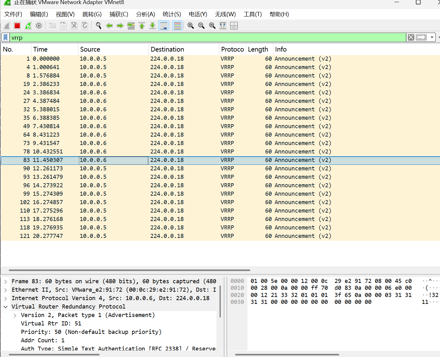 tcpdump抓取 vrrp数据包指令 tcpdump -vvv -nnn vrrp -w ~/vrrp.pcap