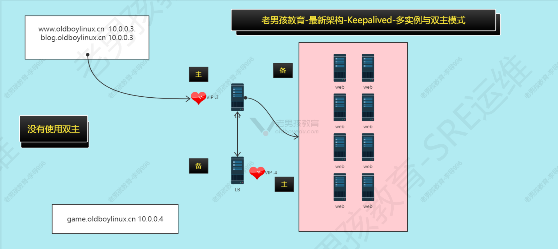 原理:设置两个组播ip,组播vip_3这一组里面lb01为主,vip_4里面lb02为主;我们需要做的就是让不同的域名解析到不同的组播ip上,可以一半一半或者按照访问量分配,尽量让两台机器分担请求,还需要注意避免雪崩现象,提前评估好如果一个挂了,另一个lb是否能承载所有请求