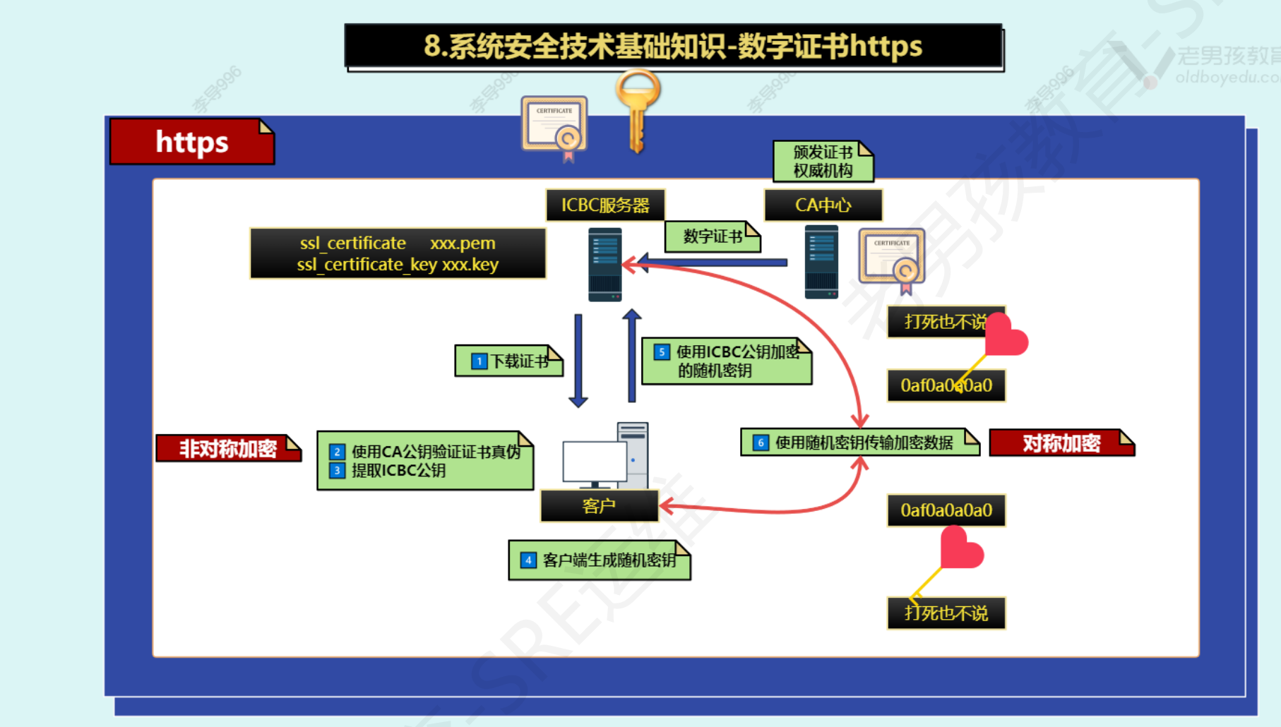 首先走非对称加密,将客户端使用网站公钥生成的随机密钥发送至服务端,后面二者之间就用对称加密进行通信