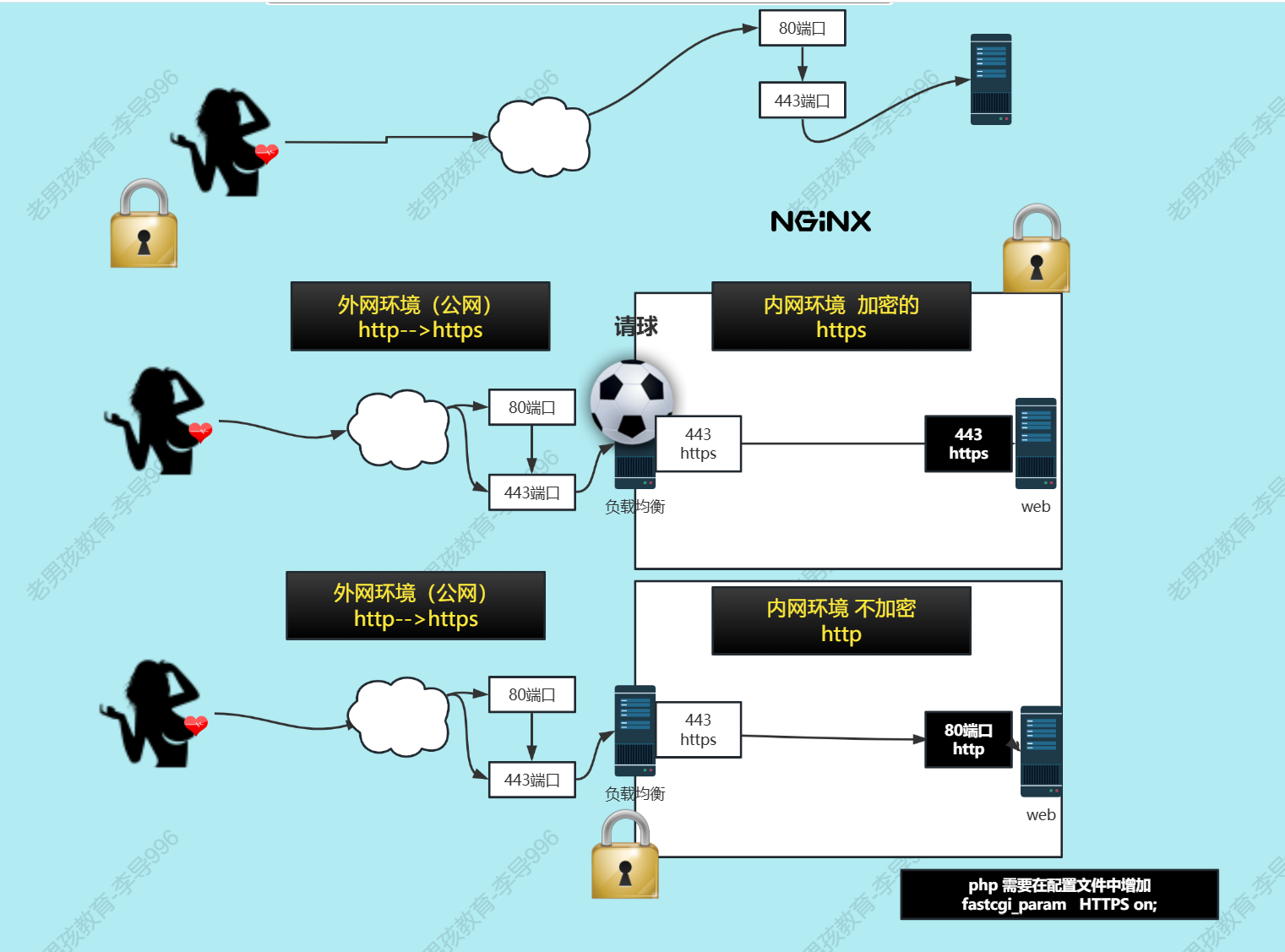 一般只有外网的机器需要配https,80跳转443后,lb将请求发给内网web服务器的80端口,内网之间可以不分配公网ip