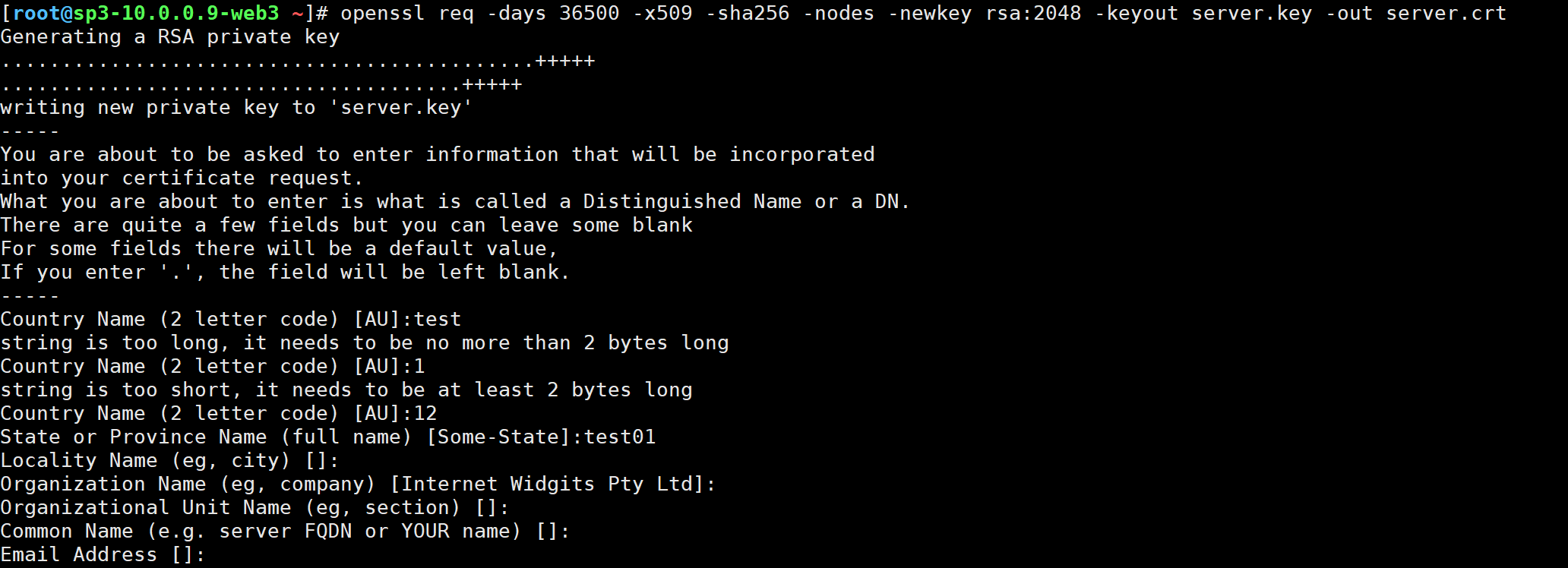 #根据私钥创建 证书 server.crt .pem证书openssl req -days 36500 -x509 -sha256 -nodes -newkey rsa:2048 -keyout server.key -out server.crt