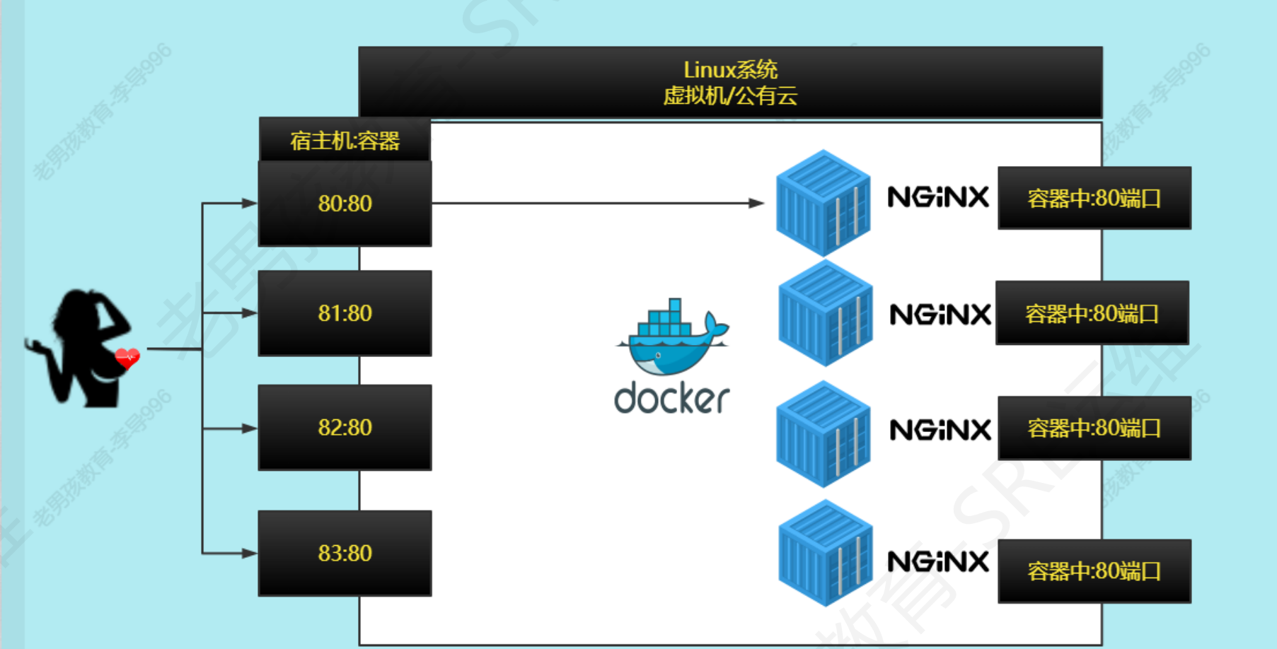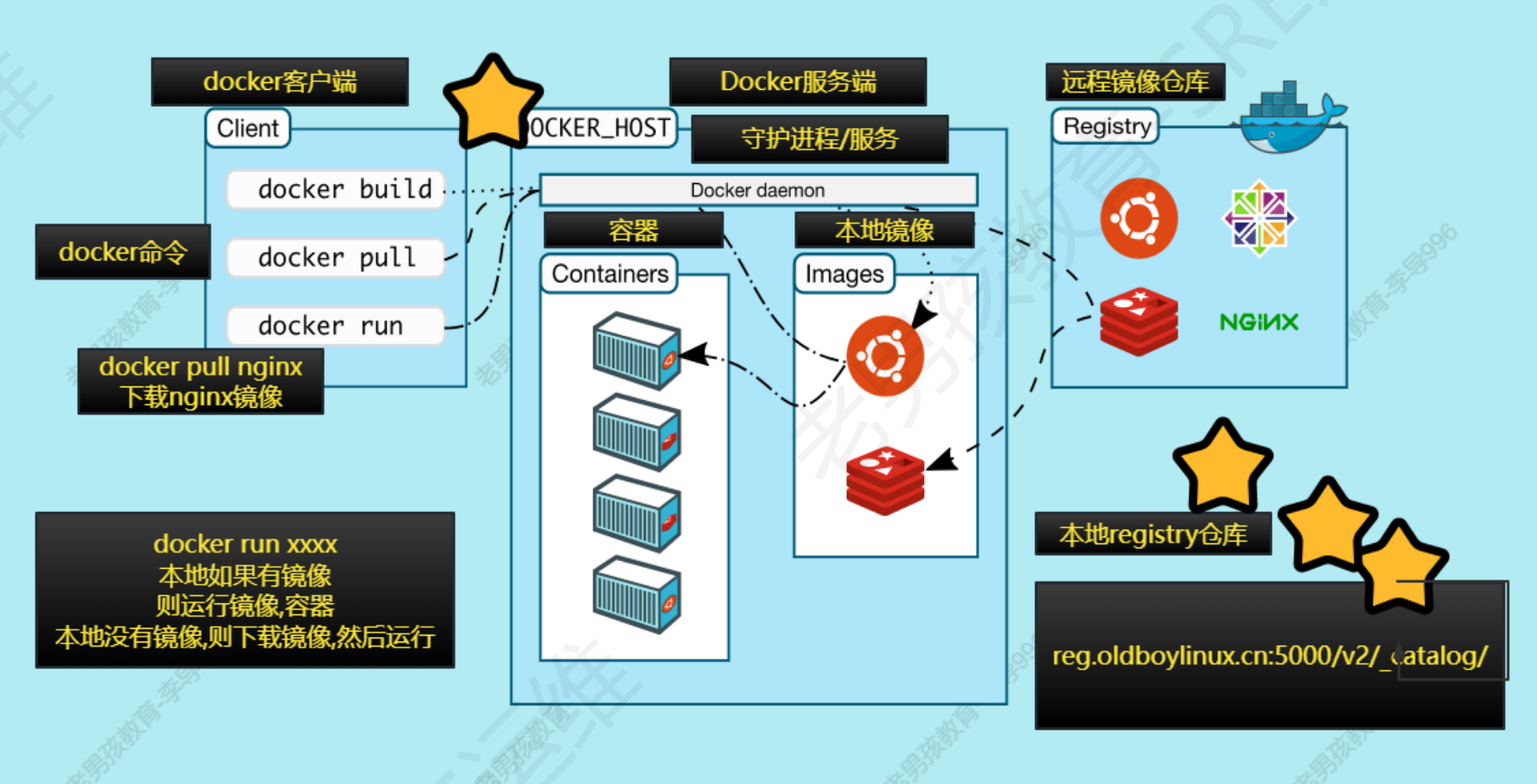 docker run -d -p 80:80 --name nginx_1st_1 nginx docker run xxxxx 选项/参数 镜像名字:版本 -d 守护进行,后台运行. -p 端口映射 宿主机端口:容器中的端口 --name nginx_1st 容器名字,不能冲突docker架构