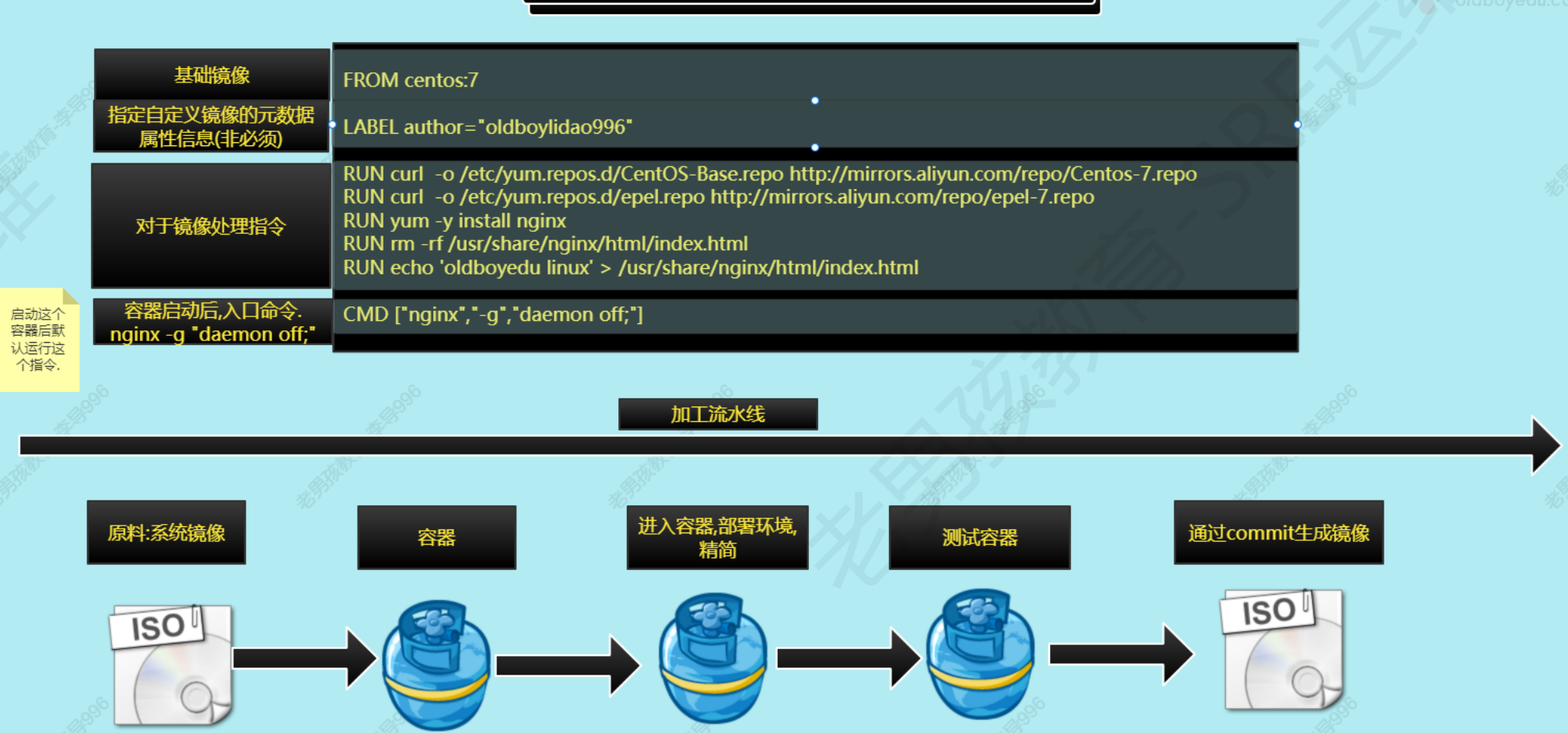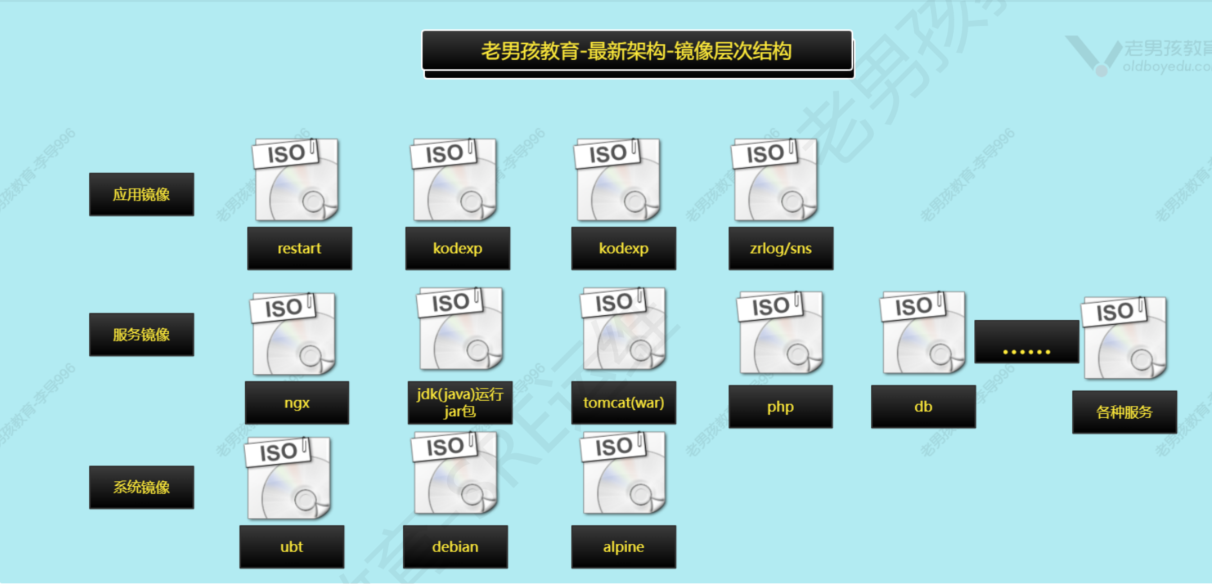镜像 image: 存放各种的环境或服务 容器 container: 进程,运行起来的镜像. 仓库(存放镜像): 远程仓库,本地仓库
