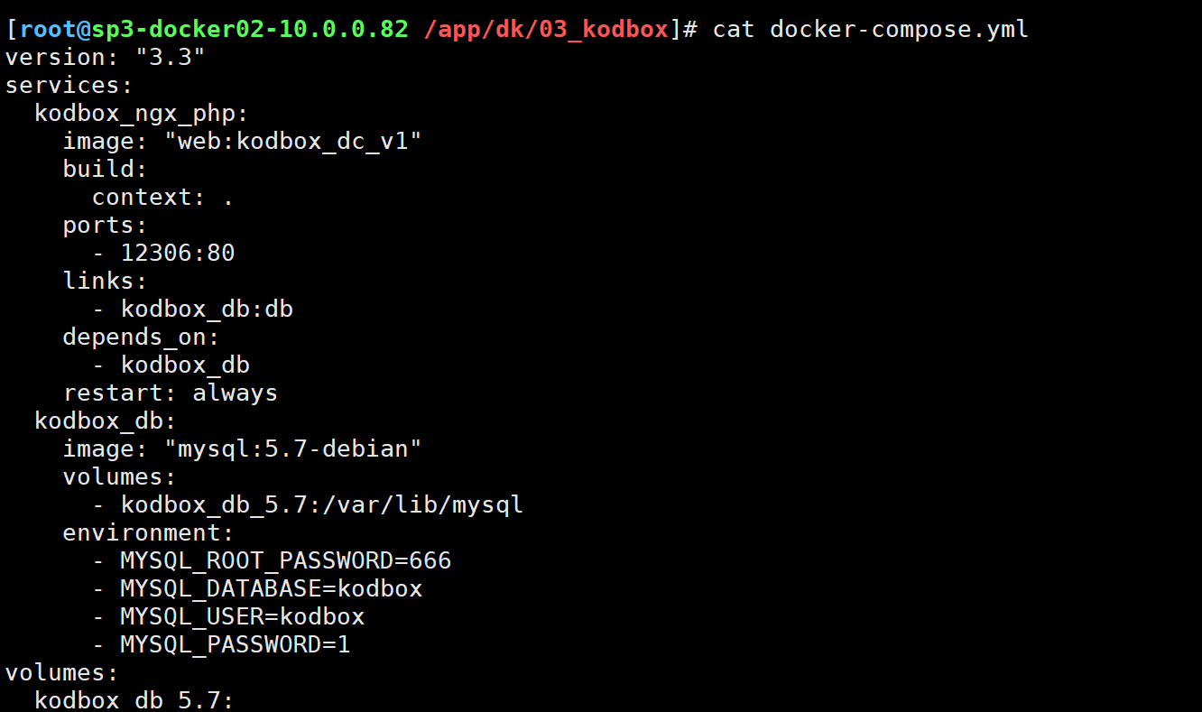 version: "3.3" services: kodbox_ngx_php: image: "web:kodbox_dc_v1" build:#根据Dockerfile构建上面名字的镜像 context: . ports: - 12306:80 links:#新版本的可以不加,会自动创建网络 - kodbox_db:db depends_on:#此kodbox容器依赖db容器 - kodbox_db restart: always kodbox_db: image: "mysql:5.7-debian" volumes:#数据卷挂载 - kodbox_db_5.7:/var/lib/mysql environment:#环境变量,同docker run 的-e - MYSQL_ROOT_PASSWORD=666 - MYSQL_DATABASE=kodbox - MYSQL_USER=kodbox - MYSQL_PASSWORD=1 volumes:#与services同级,用于自动在宿主机上创建目录 kodbox_db_5.7:
