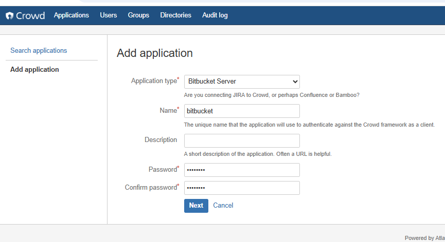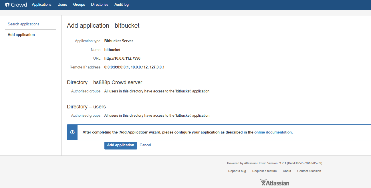 • 如jira那步添加应用程序,应用程序创建完毕,这个时候实现了对bitbucket做集中认证,就是用户在bitbucket出现了crowd的用户组和用户。