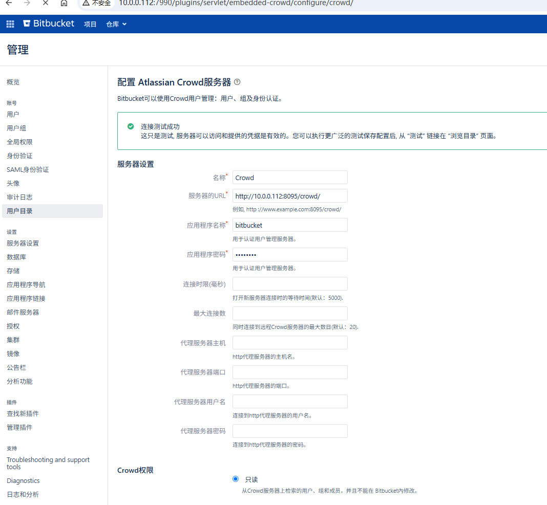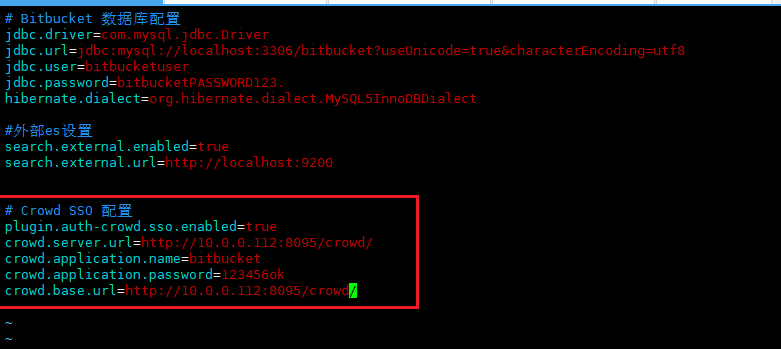 vim /var/atlassian/application-data/bitbucket/shared/bitbucket.properties添加crowd认证配置,