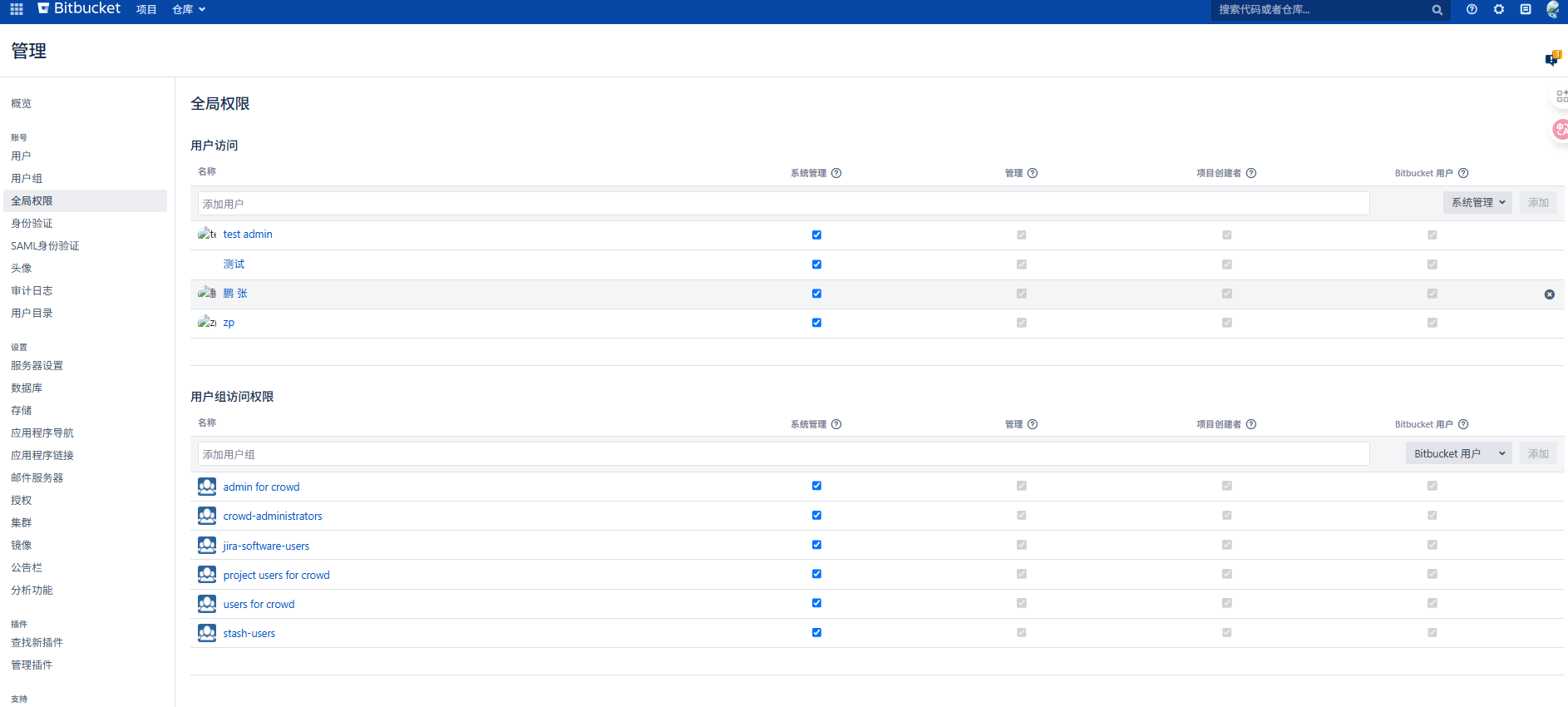 • 此时crowd用户已经出现在bitbucket中,但是此时他们是无法登陆的,需要为他们添加全局权限
