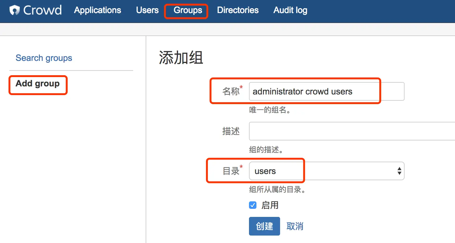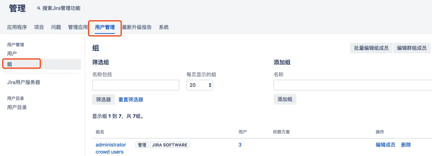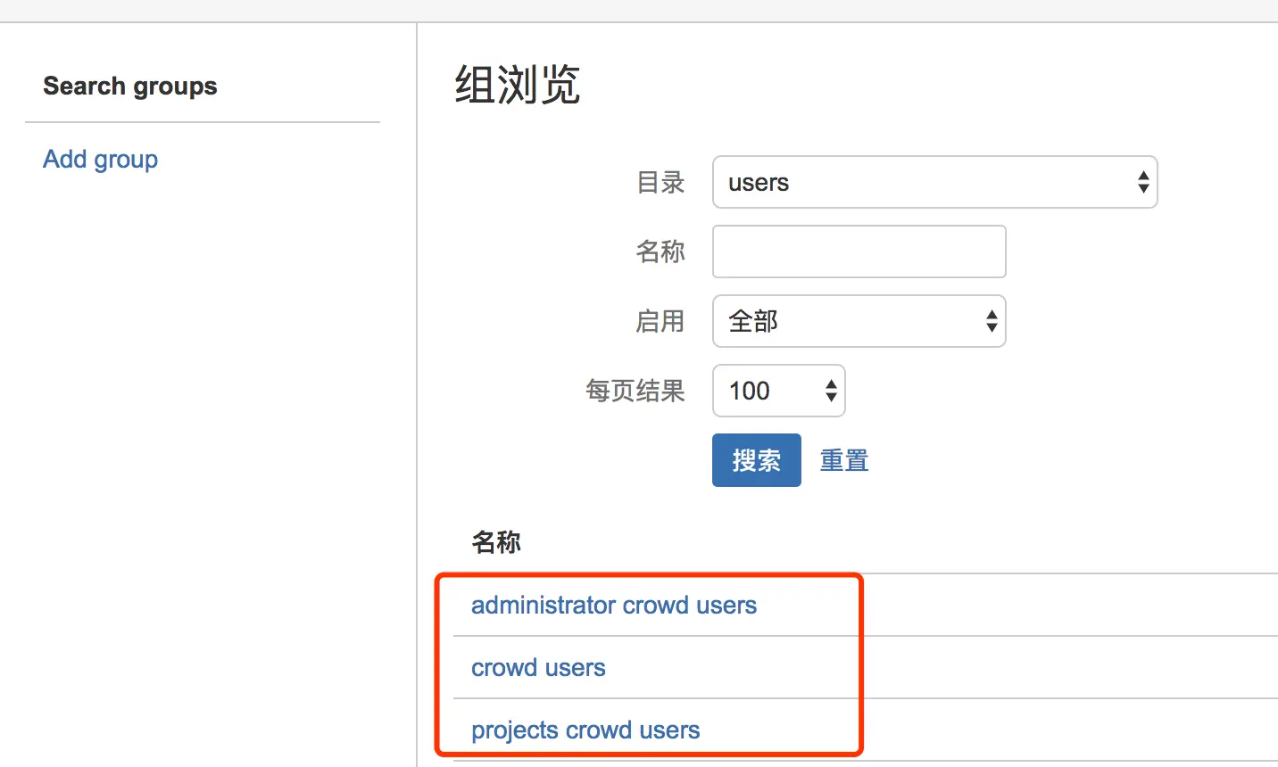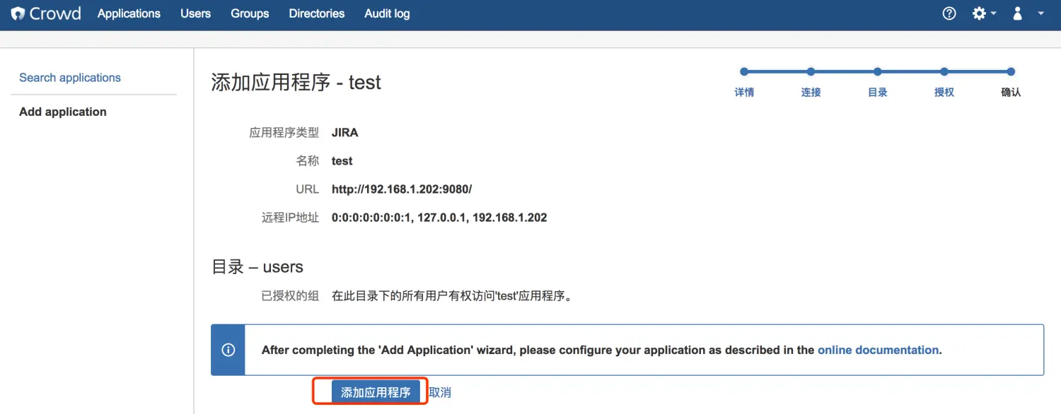 • 如jira那步添加应用程序,应用程序创建完毕,这个时候实现了对jira做集中认证,就是用户在confluence出现了crowd的用户组和用户。