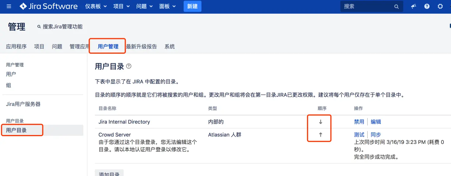 登录Jira的管理部分 单击“ 用户管理”下左侧栏的“ 用户目录 ”标签。 标签。 点击“ 添加目录 ”。然后从下拉列表中选择“ Atlassian Crowd ”。单击“ 下一步 ”。 输入连接参数并保存。现在,新的Crowd目录应该出现在用户目录列表中,创建完如下,可以通过顺序调整内部目录和外部目录的权限:
