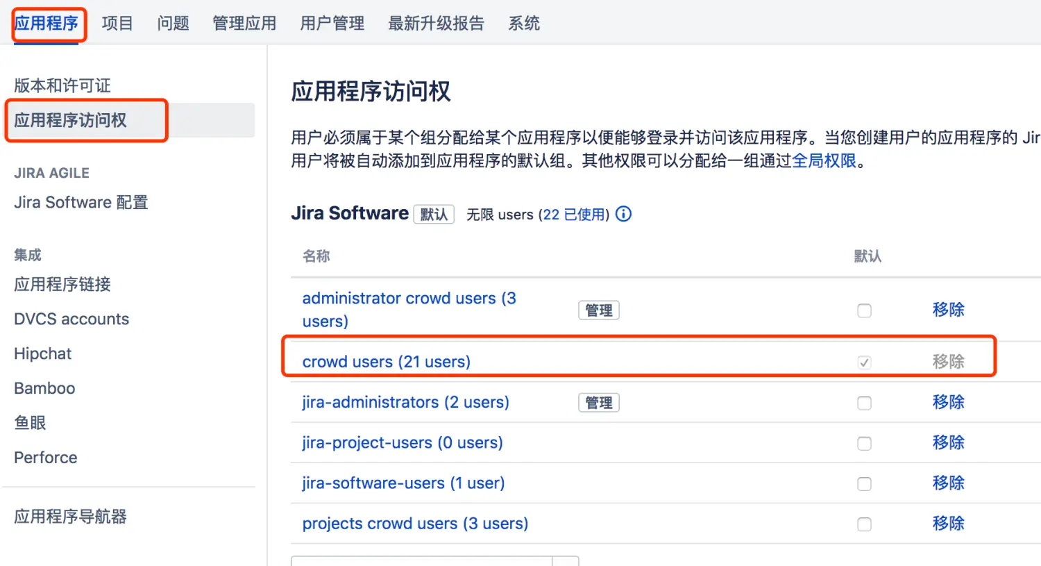 • 如果crowd用户无法登陆,注意修改应用程序访问权,赋予crowd组应用程序访问权。