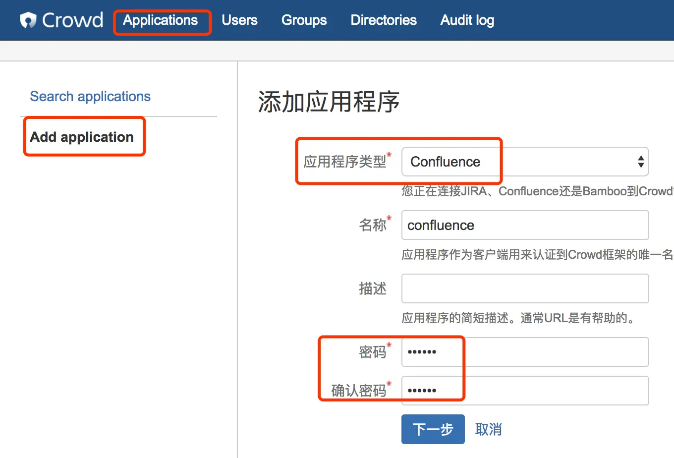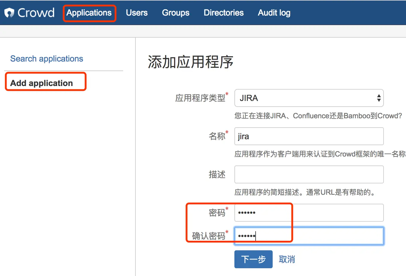 crowd端添加应用程序,注意:要记住这块填写的密码,后面会用到