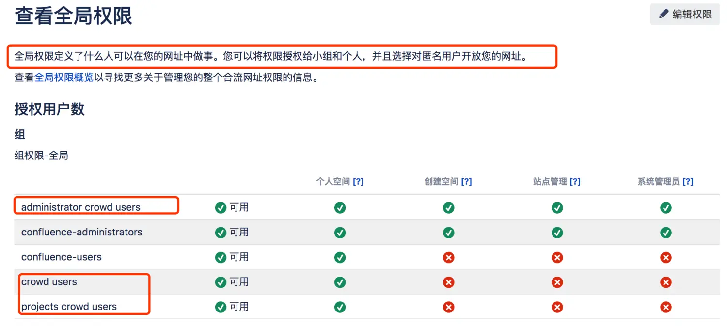 • 此时crowd用户已经出现在confluence中,但是此时他们是无法登陆的,需要为他们添加全局权限
