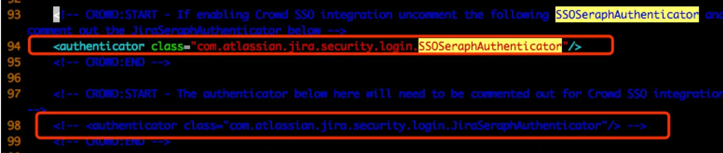 2 编辑JIRA/atlassian-jira/WEB-INF/classes/seraph-config.xml文件。注释掉authenticator 节点:(第100行)