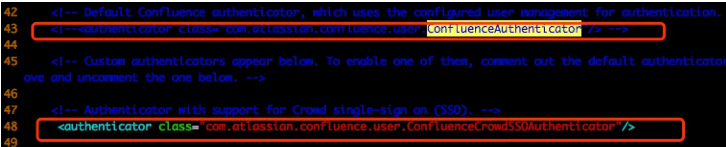 vim confluence_home/confluence/WEB-INF/classes/seraph-config.xml 注释43行,取消注释48行