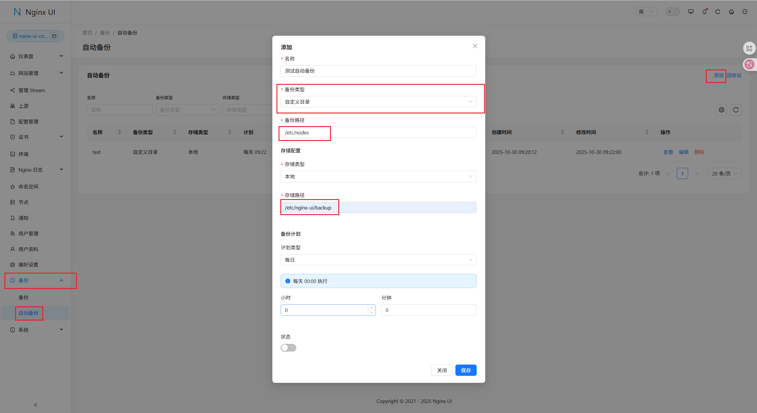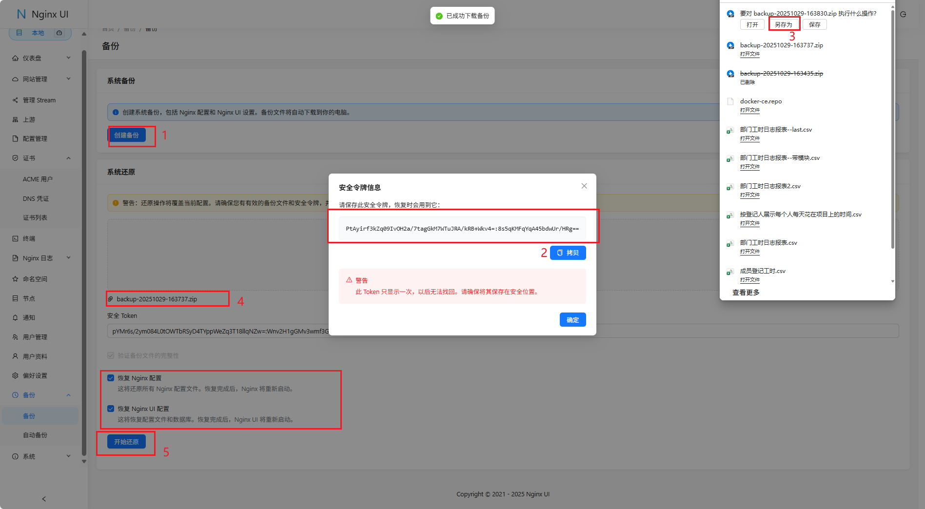 创建/恢复备份(nginx配置文件+nginxui数据库+配置文件)注:本地部署才能进行正常的备份/恢复