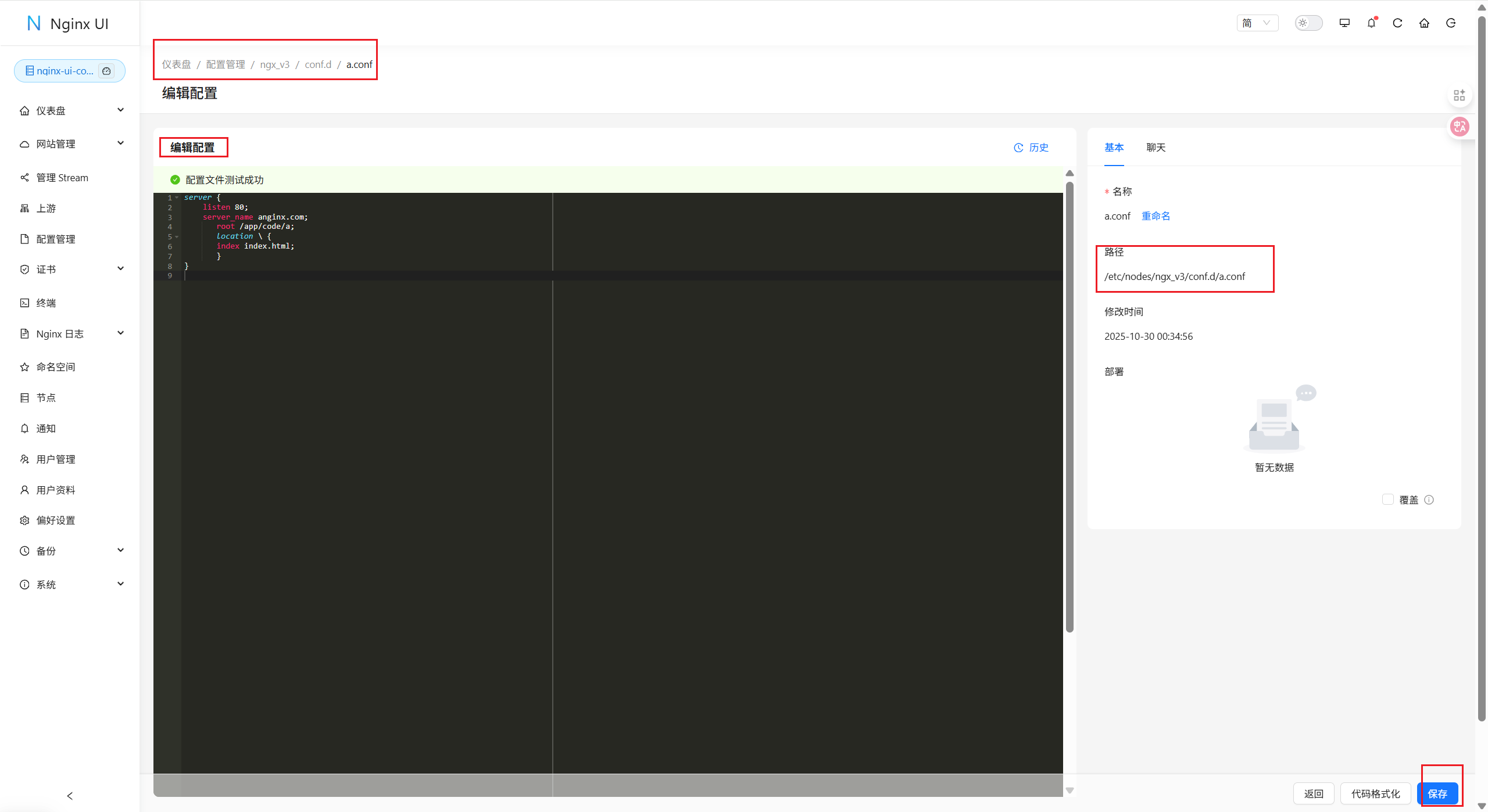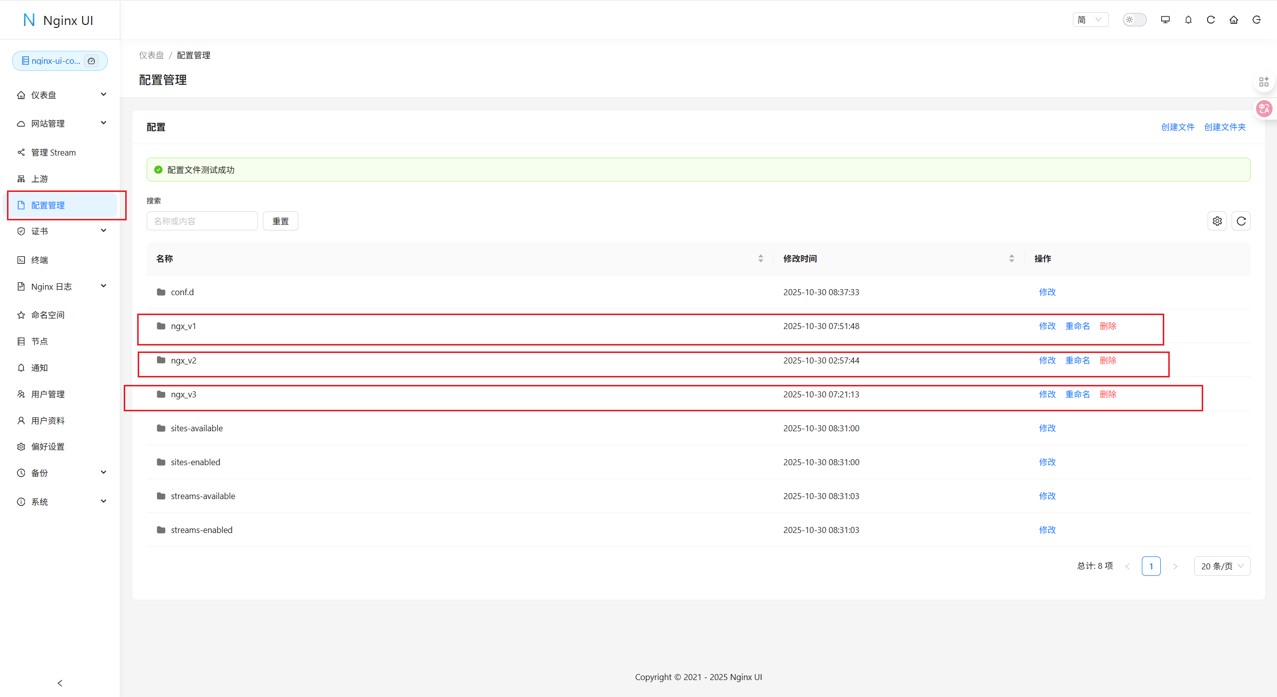 配置管理红框中的ngx_v1即nginx容器的/etc/nginx目录,点击修改进入