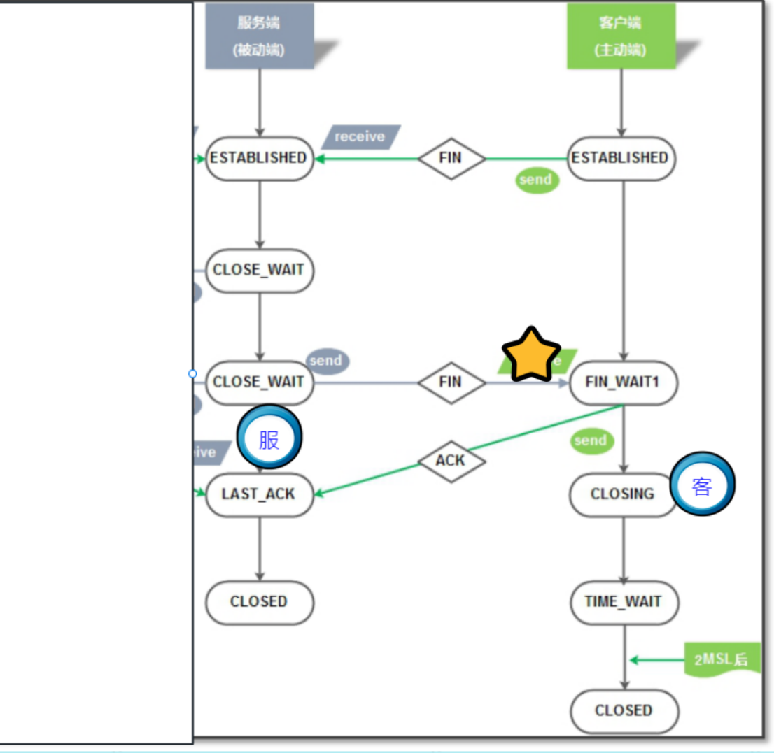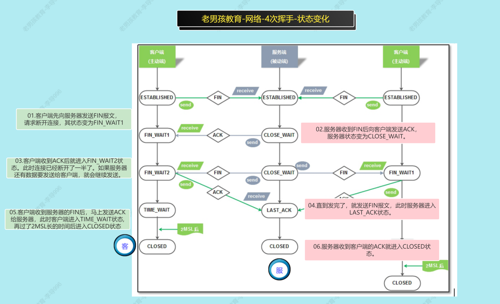 客户端05.:客户端收到服务器的FIN后,马上发送ACK给服务器,此时客户端进入TIME_WAIT状态,再过了2MSL长的时间后进入CLOSED状态。