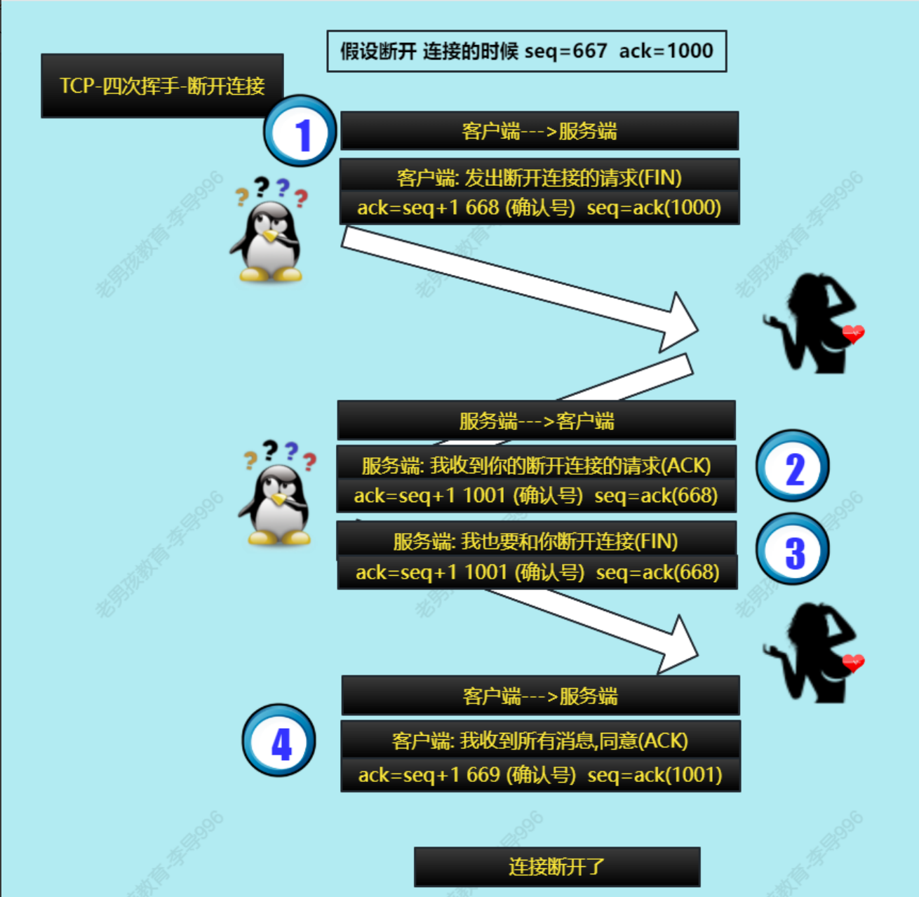 ①客户端:发出断开连接请求:(FIN)断开连接请求,seq=1000,ack=668