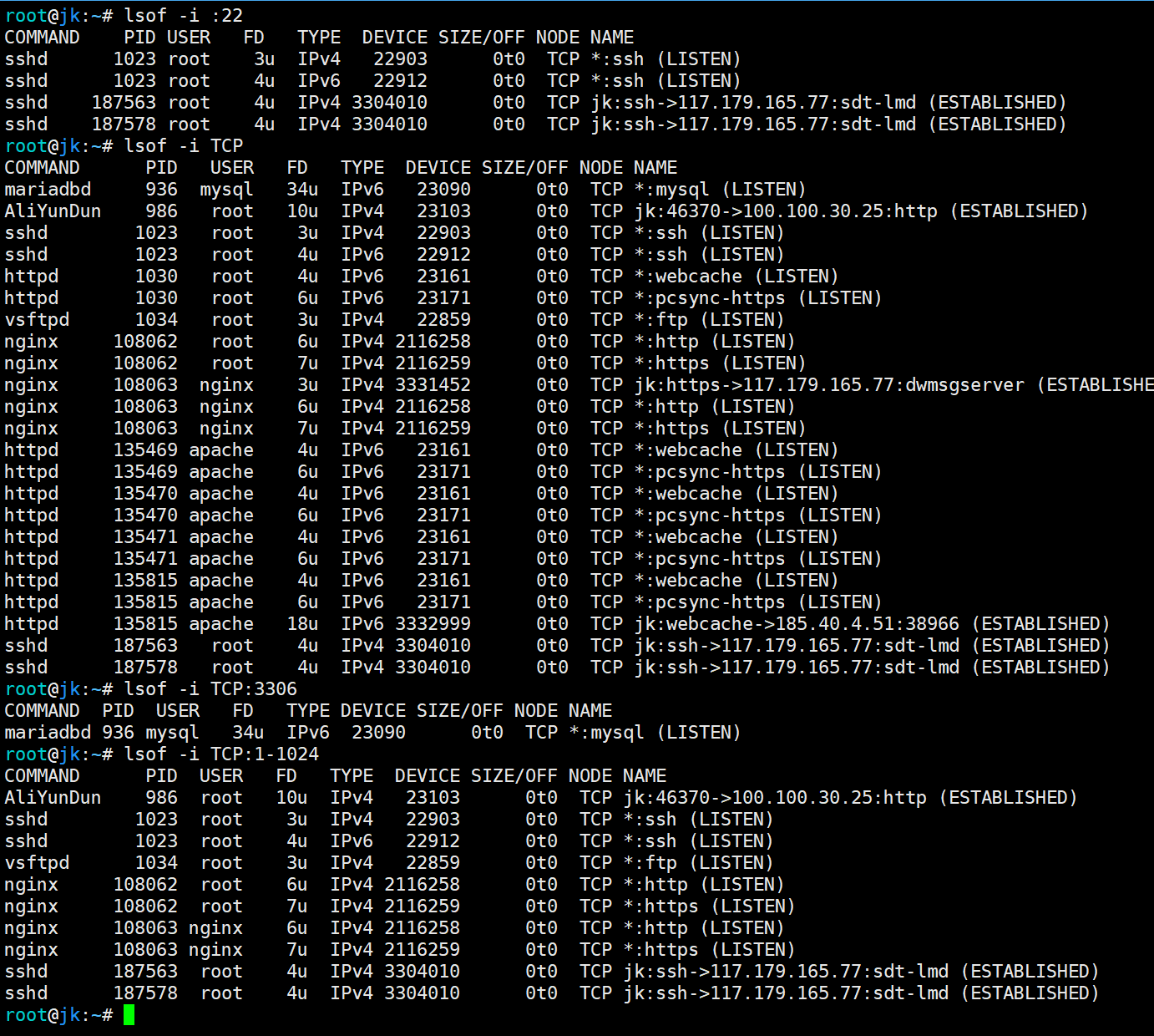 -i TCP:3306 列出使用了TCP 协议并且端口为3306的文件