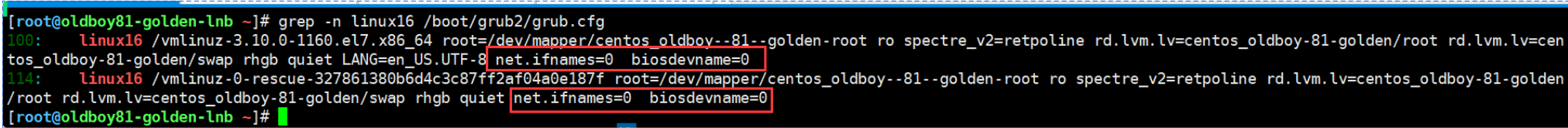 1.修改/boot/grub2/grun.cfg,搜索linux16的行加上netifnames=0 biosdevname=0(适用于centos7)