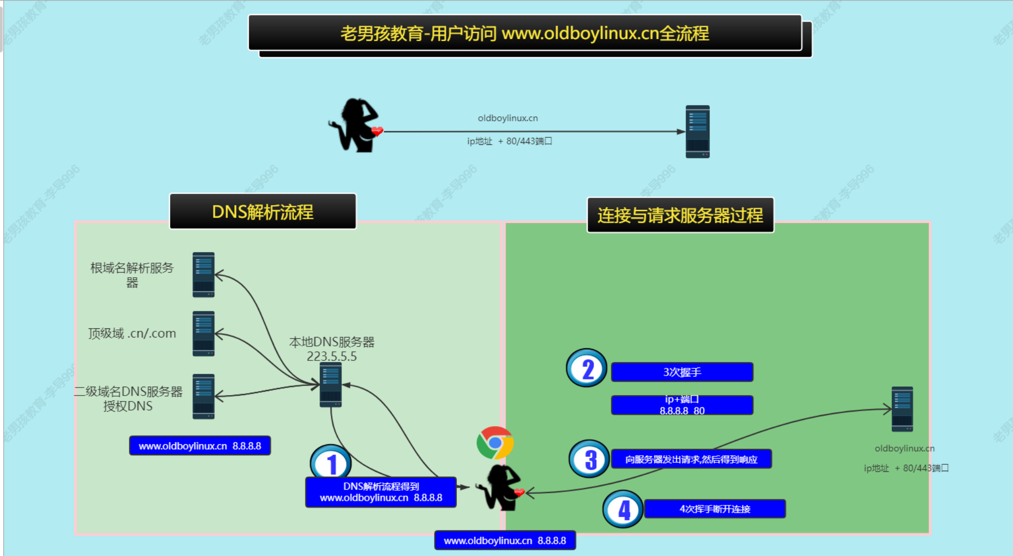 2.用户:ip加端口与对应服务器的端口(80/443)建立连接,三次握手