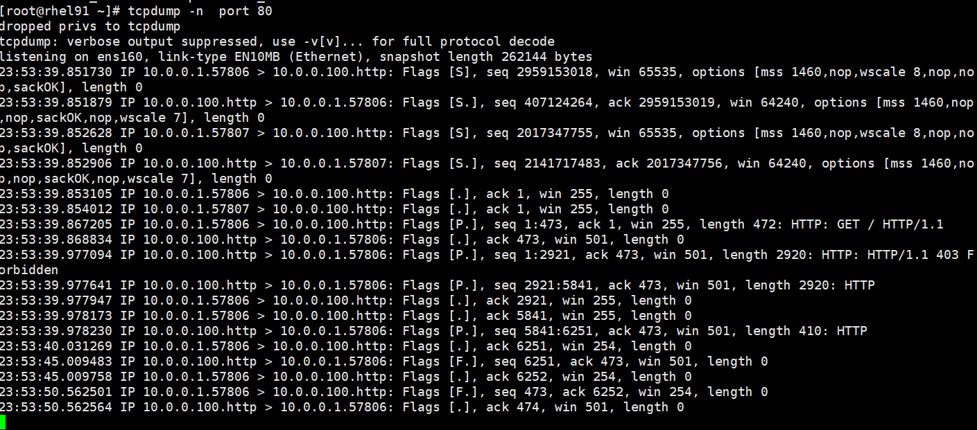 tcpdump -nn -i eth0 port 80 查看80端口数据