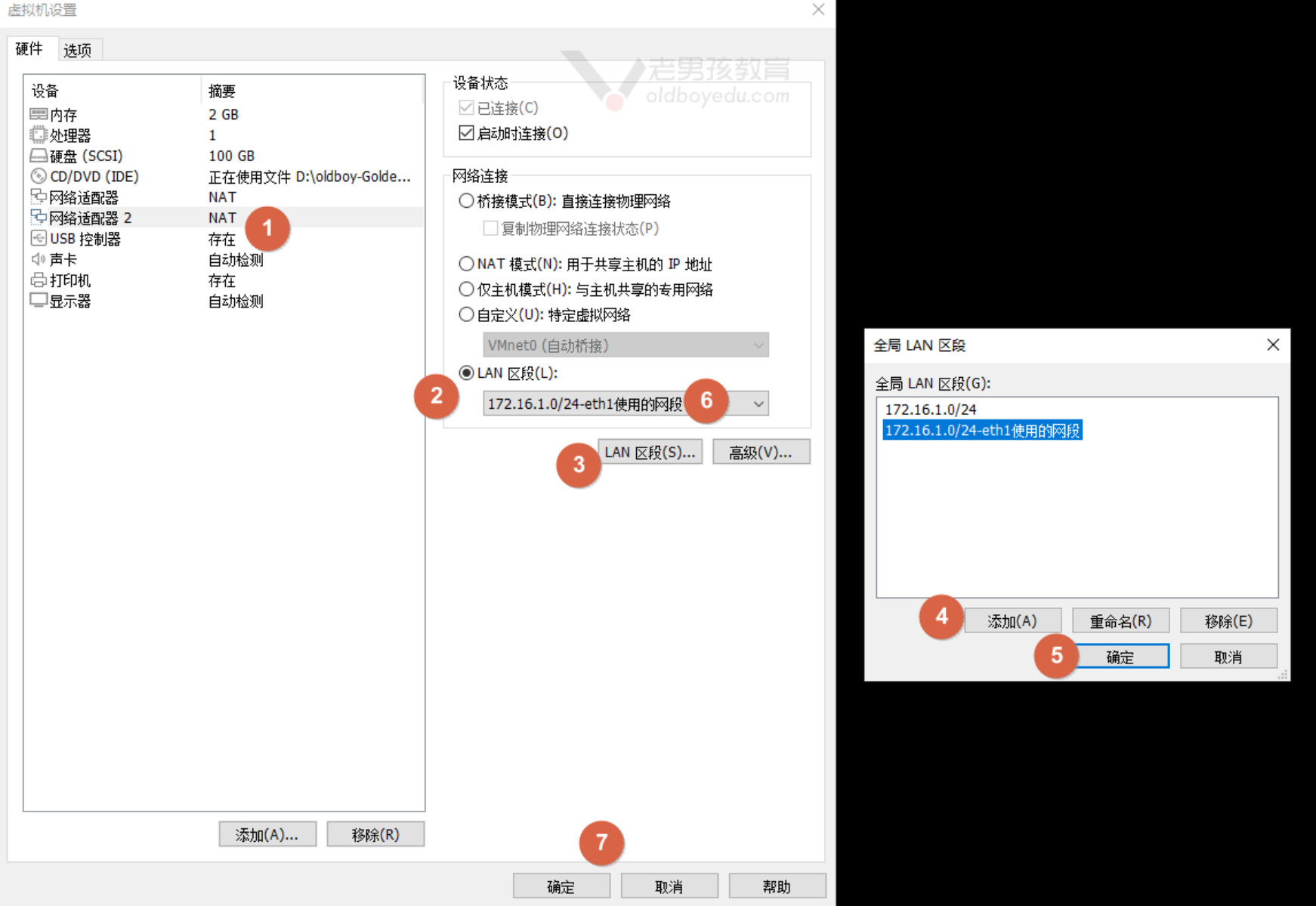 eth1: lan区段网卡(添加1次即可,所有虚拟机都可以使用此区段)